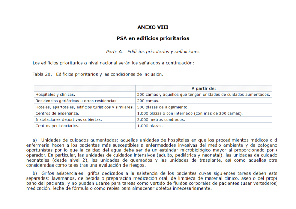 Los hospitales son edificios prioritarios (siempre que tengan más de 200 camas (ANEXO VIII), que tendrán un PSA (Plan Sanitario del Agua).
