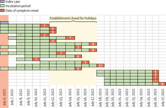 La aparición de ese brote se debió como indican los autores a «numerosas irregularidades sanitarias». «Se realizó un muestreo en tres áreas: las superficies de trabajo de apoyo, las mesas y sillas de de trabajo, las mesas y sillas de trabajo, y los objetos punzantes y otros instrumentos de trabajo. Las tres muestras dieron positivo para el virus de la viruela del mono». Un «segundo muestreo … se centró en los objetos punzantes y los instrumentos de trabajo. 15 (94%) de las 16 muestras muestras resultaron positivas para el virus, las puntas de pinzas y tijeras presentaban la mayor carga vírica según los valores umbral de ciclo». Y acaban como conclusión: «el virus de la viruela del mono puede transmitirse a través de la exposición a material material de piercing o tatuaje y, potencialmente a través de las manos contaminadas, debido a pobres medidas de asepsia y de manipulación del material». En otro artículo se llega a la misma conclusión.