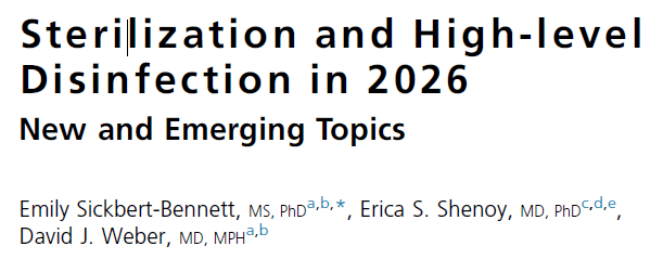 - Sickbert-Bennett, E., Shenoy, E. S., & Weber, D. J. (2026). Sterilization and high-level disinfection in 2026: New and emerging topics. Infectious Disease Clinics of North America. Advance online publication. https://doi.org/10.1016/j.idc.2025.12.006