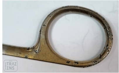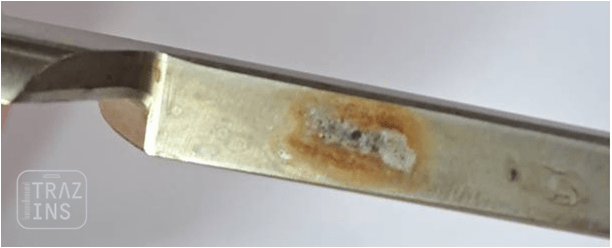 Se presentan por defectos en el lavado. Para su identificación es importante, una vez lavados, revisar especialmente las zonas de difícil acceso del instrumental: bocas, partes dentadas, cremalleras, ranuras, zonas de unión, anclajes… Los restos de sangre que pueden quedar adheridos al instrumental, si no se retiran totalmente, pueden causar la aparición de corrosión por picadura, por el contacto de los iones cloruro que contiene con la superficie del instrumental. Además, los restos de suciedad pueden comprometer la seguridad de utilización del instrumental por posibilidad de contaminación cruzada, riesgo de IRAS y por no garantizar un correcto proceso de esterilización por presencia de biofilm.