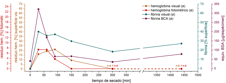 Descubrimos que la sangre durante el proceso de secado es especialmente difícil de eliminar en las primeras 1-2 horas. En esta fase, en la que la sangre está ya coagulada pero aún no se ha secado completamente, quedaban muchos más residuos proteicos en las muestras que después de tiempos de reposo más largos o al inicio, directamente después de la preparación de las placas.