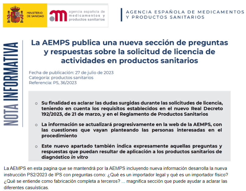 El documento compila las dudas más frecuentes que se han planteado a la AEMPS, por lo que su actualización será continua en base a futuras consultas. En general las cuestiones están planteadas con respecto a los requisitos establecidos en el Real Decreto 192/2023 y Reglamento (UE) 2017/745.